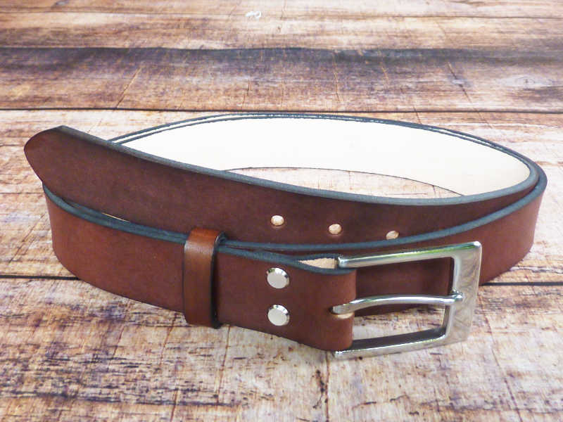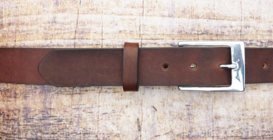 Besonders hochwertiger handgefärbter 33mm breiter Vollrindsledergürtel mit fest vernieteter Edelstahlschnalle (glänzend), matter Oberfläche und loser Lederschlaufe.