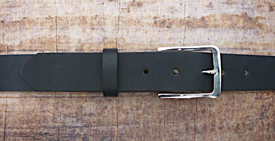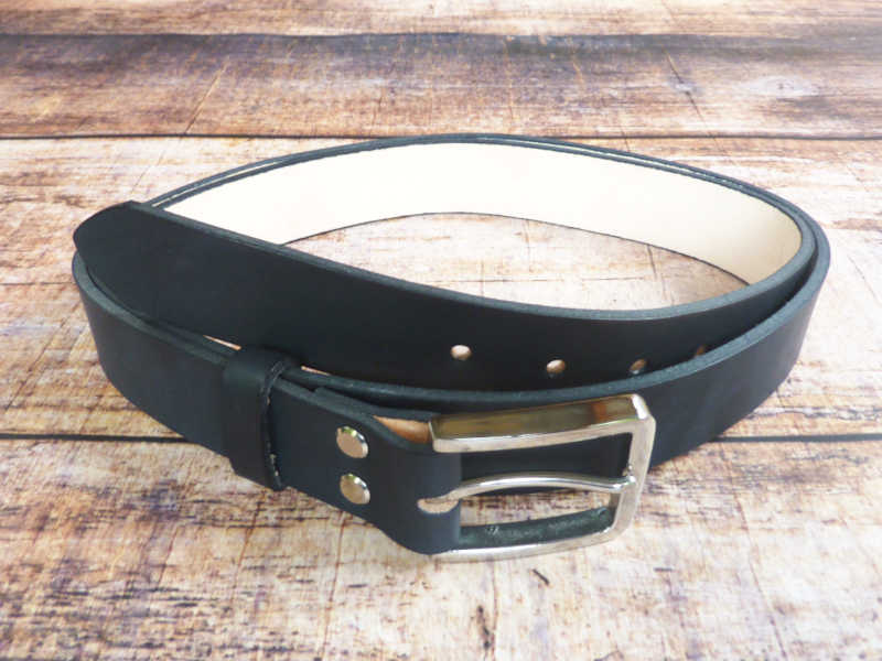 Besonders hochwertiger handgefärbter 33mm breiter Vollrindsledergürtel mit fest vernieteter Edelstahlschnalle (glänzend), matter Oberfläche und loser Lederschlaufe.