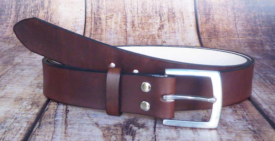 Besonders hochwertiger hangdefärbter 38mm breiter Vollrindsledergürtel mit fest vernieteter Edelstahlschnalle ( glänzend ), matter Oberfläche und loser Lederschlaufe.