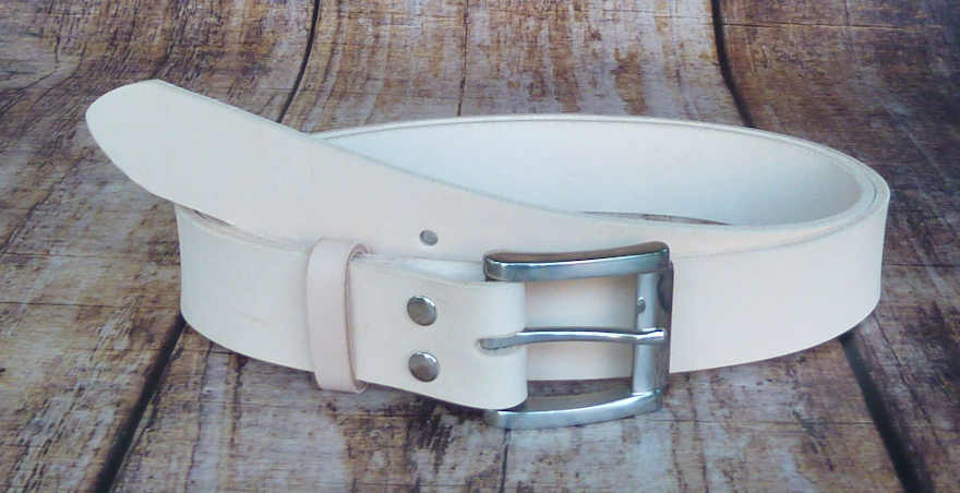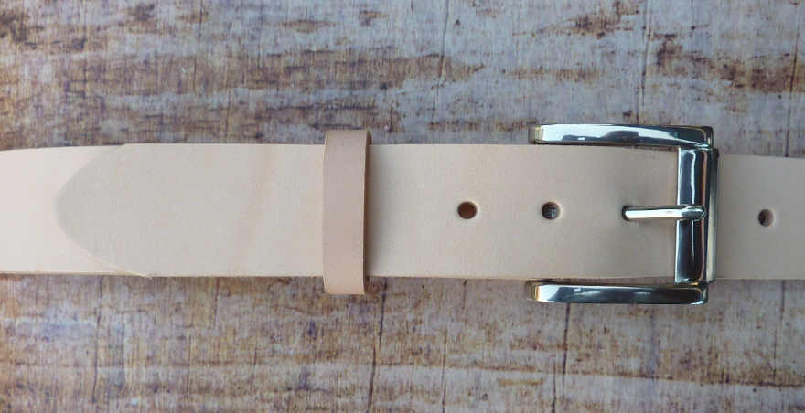 Besonders hochwertiger 38mm breiter Vollrindsledergürtel mit fest vernieteter Edelstahlschnalle (glänzend), matter Oberfläche und loser Lederschlaufe.
