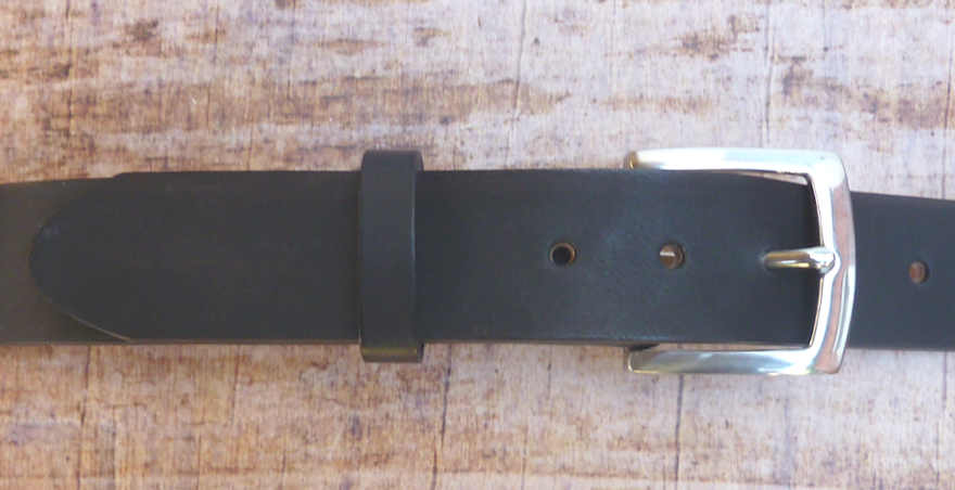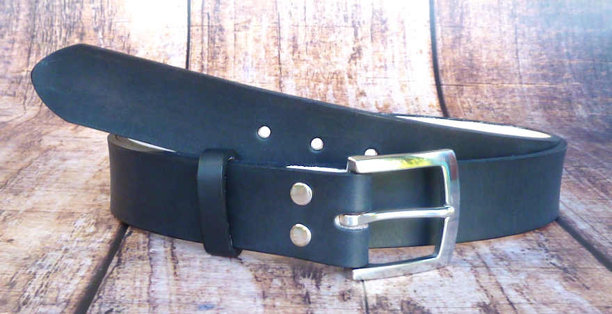 Besonders hochwertiger hangdefärbter 38mm breiter Vollrindsledergürtel mit fest vernieteter Edelstahlschnalle ( glänzend ), matter Oberfläche und loser Lederschlaufe.