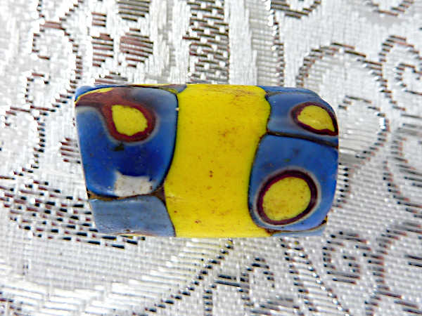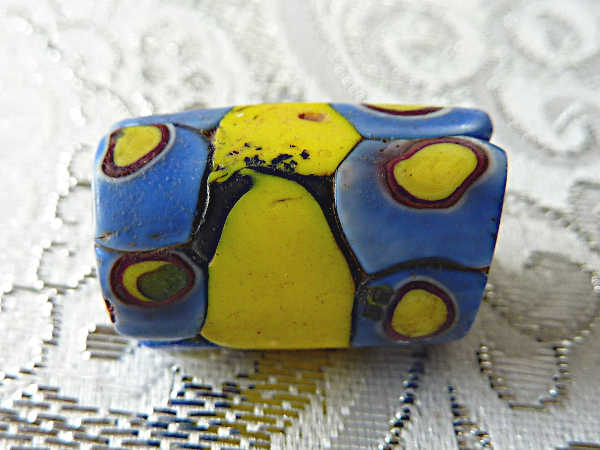 Die Farben dieser Millefiori-Perle: gelb, blau, schwarz